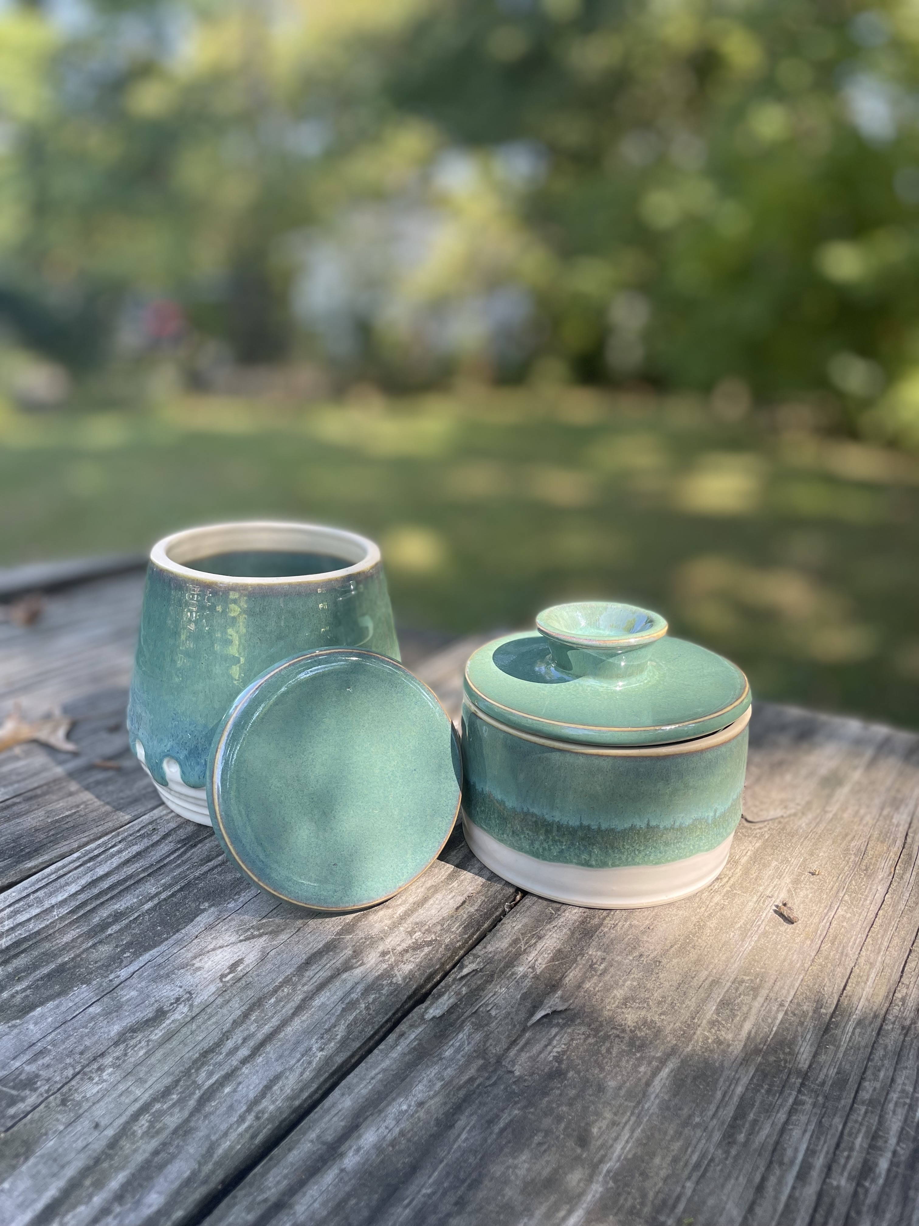 Hand thrown garlic jar and butter bell.
