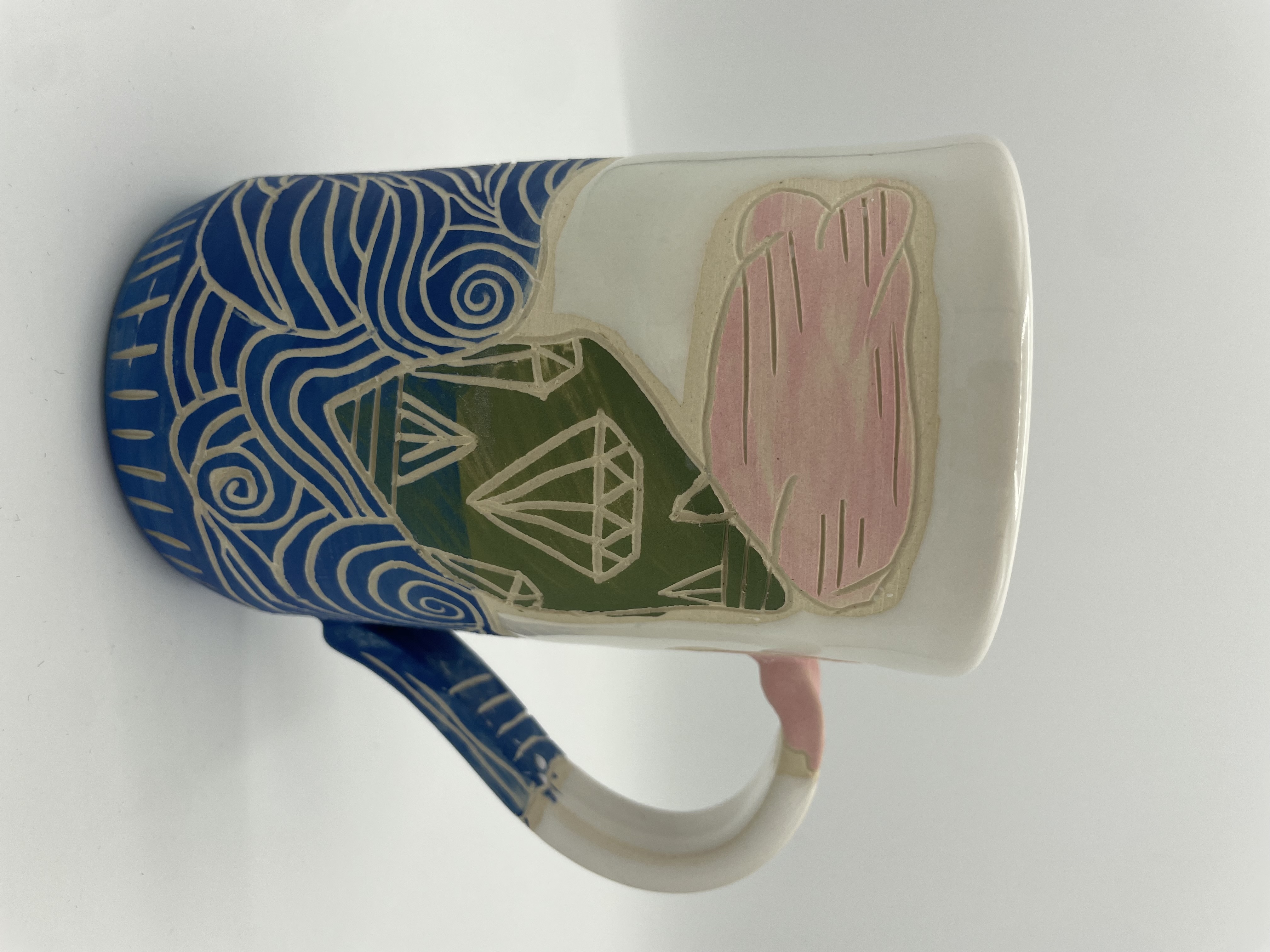 A lovecloud collaboration between Allie and Nell. Hand thrown mug that’s then been painted and carved. Glazed inside left raw on the outside.