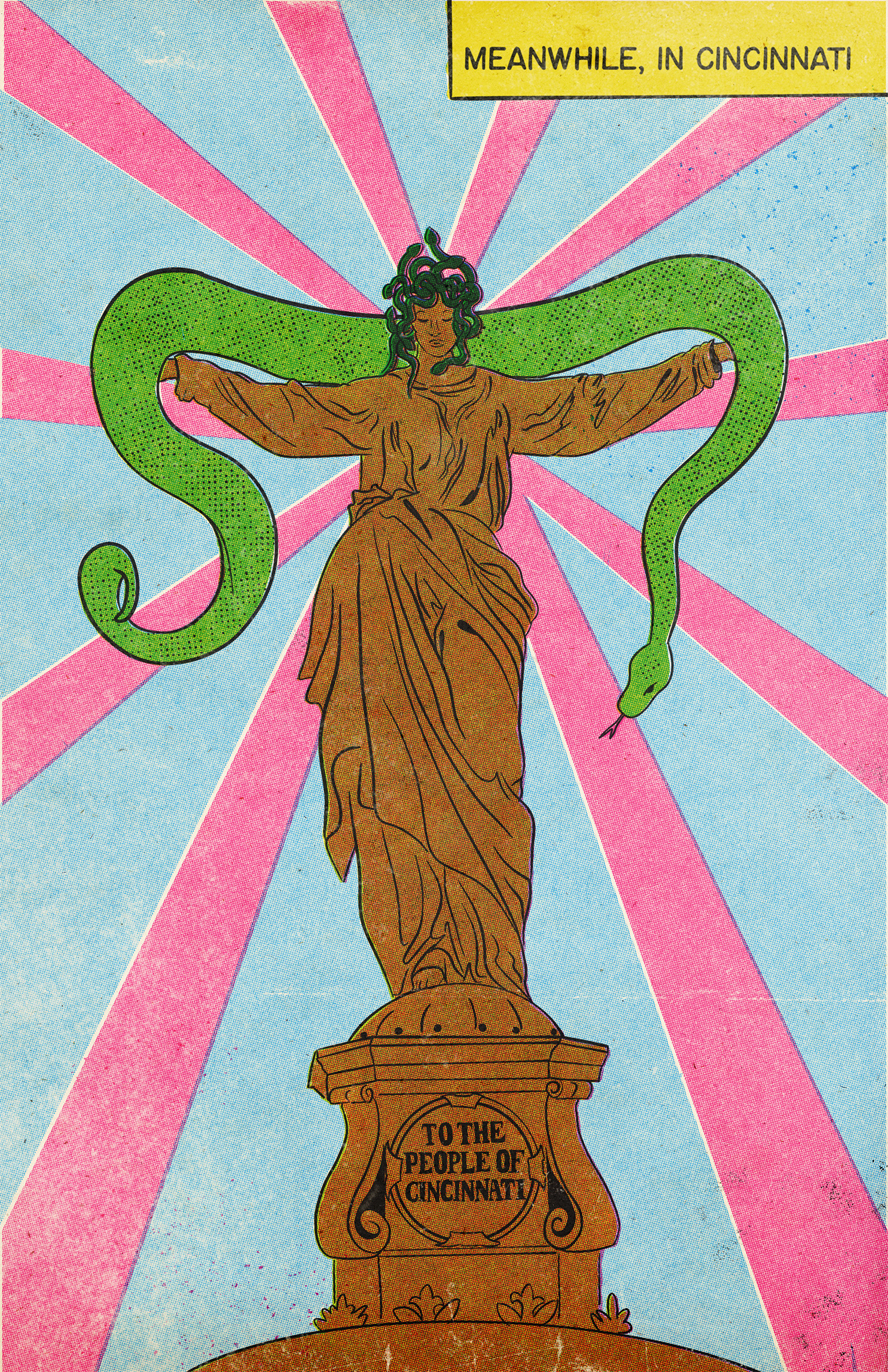 A flying spaghetti monster disguised as a classic Cincinnati three-way hovers over a familiar sign, blending local food culture with playful, comic-style absurdity.