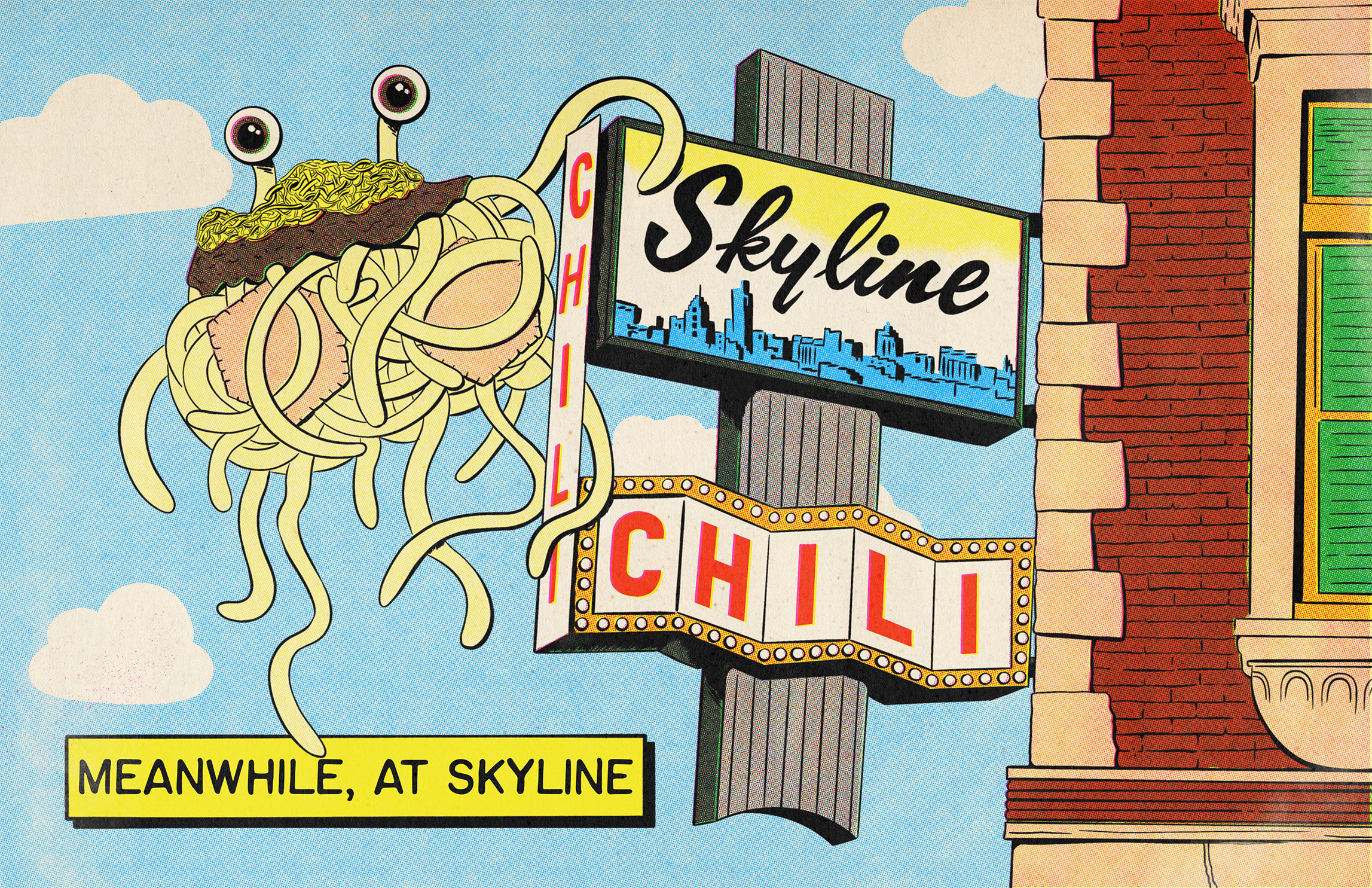 A flying spaghetti monster disguised as a classic Cincinnati three-way hovers over a familiar sign, blending local food culture with playful, comic-style absurdity.
