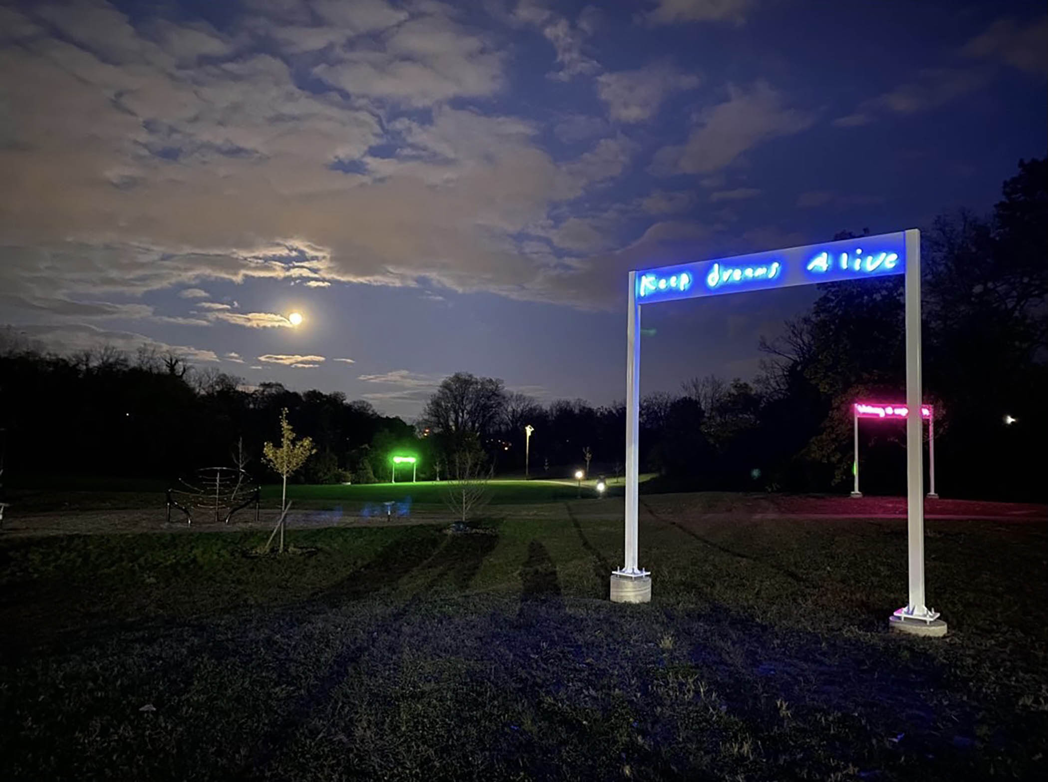 In Spring 2020, Calcagno Cullen led Apprentice Artists James Bond and Candace Krois to create a participatory public sculpture project entitled ‘What We Need To Hear’ in the Avondale neighborhood of Cincinnati. We created interactive boxes that asked residents to “Write words to positively motivate” their neighbors. We placed these hand crafted boxes, equipped with lollipops and cards for submissions, around the neighborhood at the Laundromat, Library, Rec Center, and elsewhere, and as a result they received over 75 responses. Four of these submissions were selected to become permanent, large-scale, light-up sculptures at the Hirsch Recreation Center to provide both inspiration and safety along their new walking trail.