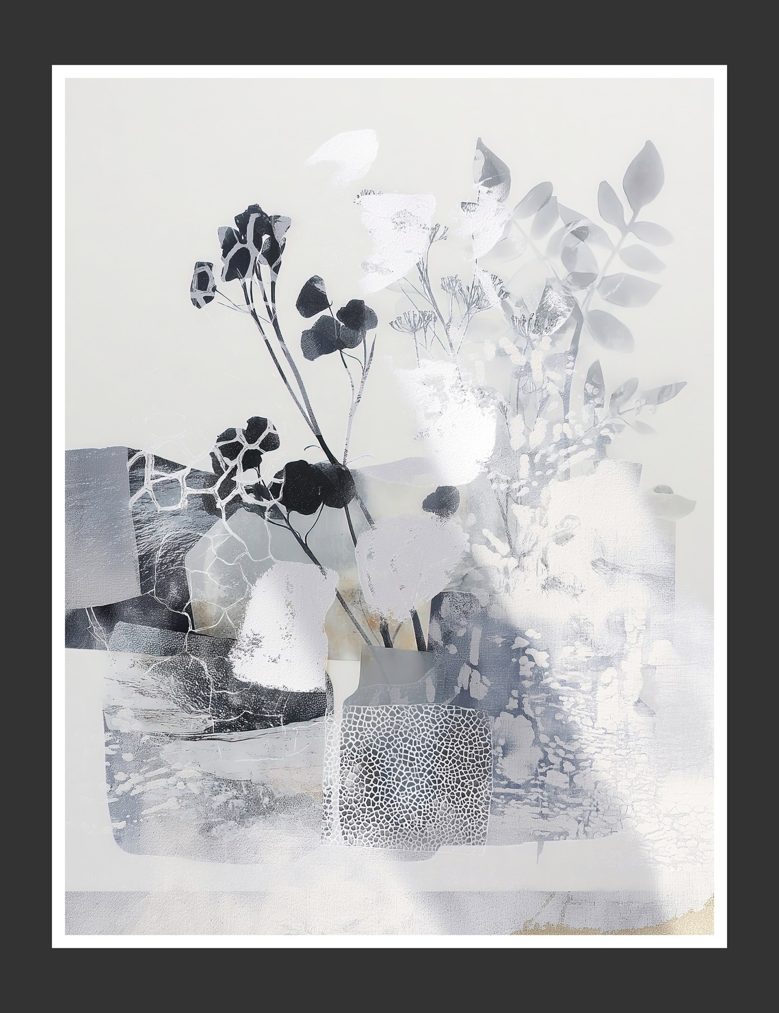 The resulting compositions reflect an emotional architecture of transition: from opacity to transparency, order to rupture, and ultimately, silence to growth. These prints are not declarations but meditative moments—each one a square of breath held, and then released.