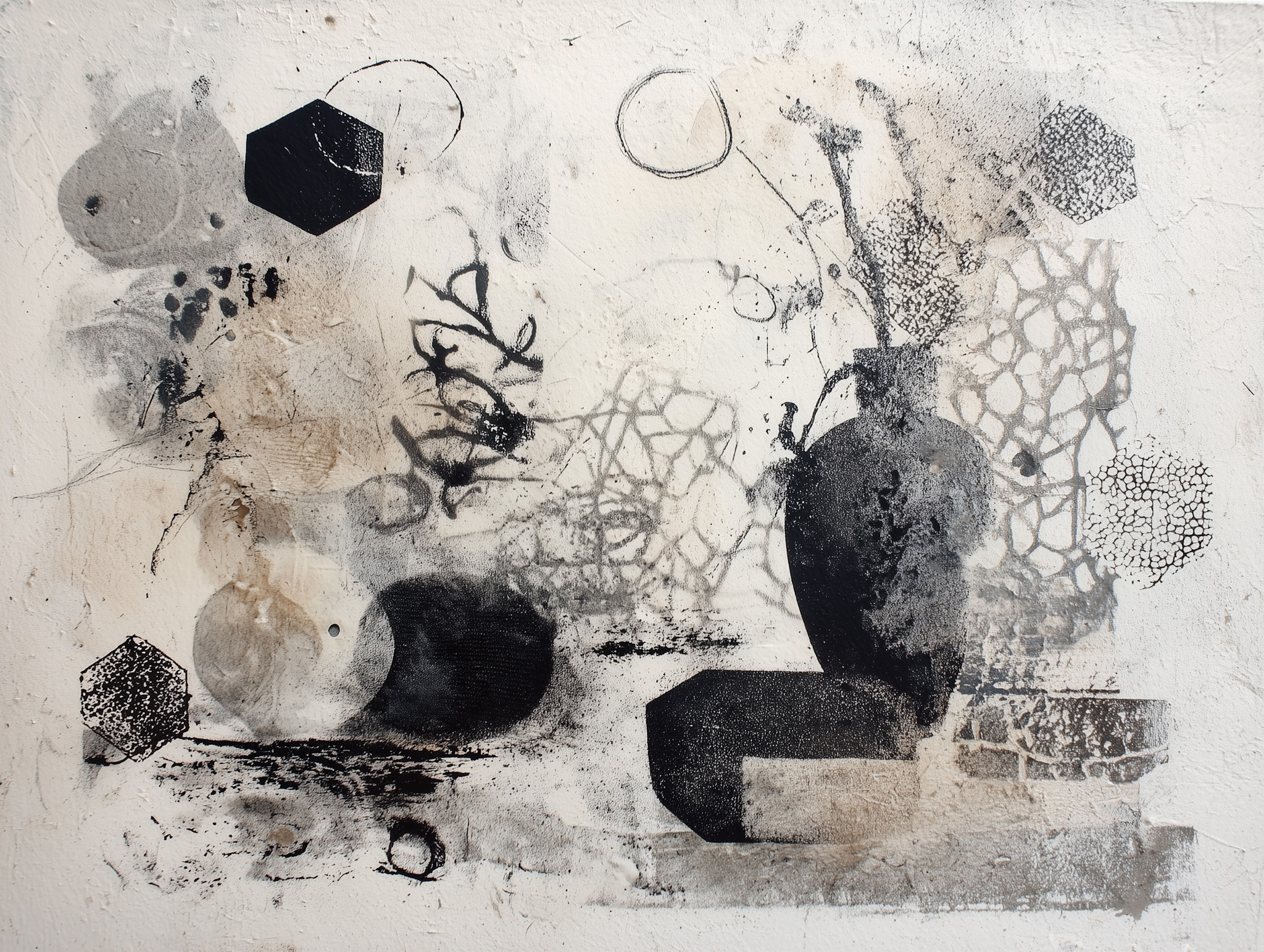 A study in held form—where density, boundary, and pattern gather without collapse. The surface resists clarity while quietly recording pressure, memory, and restraint.