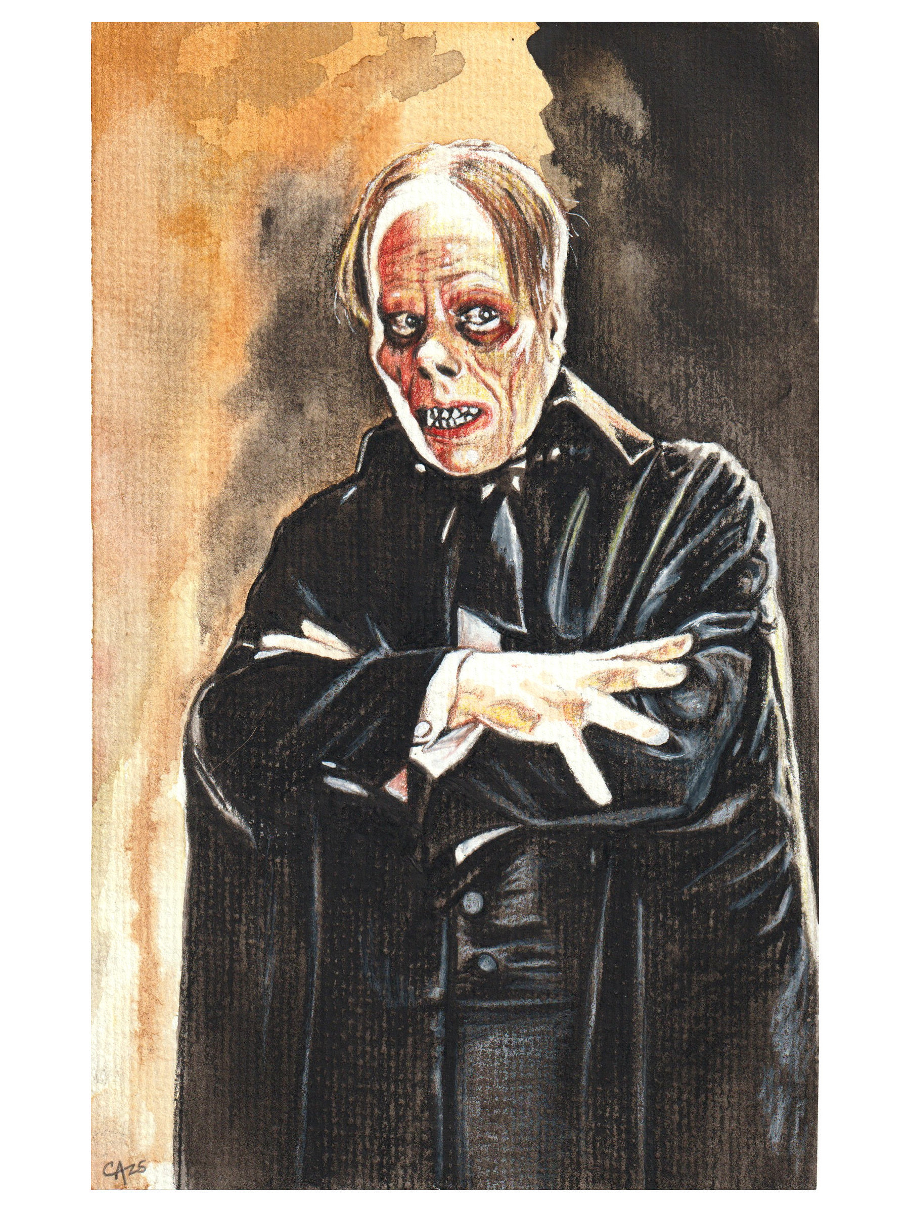 Batman and Caesar Romero Joker are watercolor wash bases with colored pencil layering n 8”x10” watercolor paper, Heath Ledger and Joaquin Phoenix Jokers are watercolor only.
