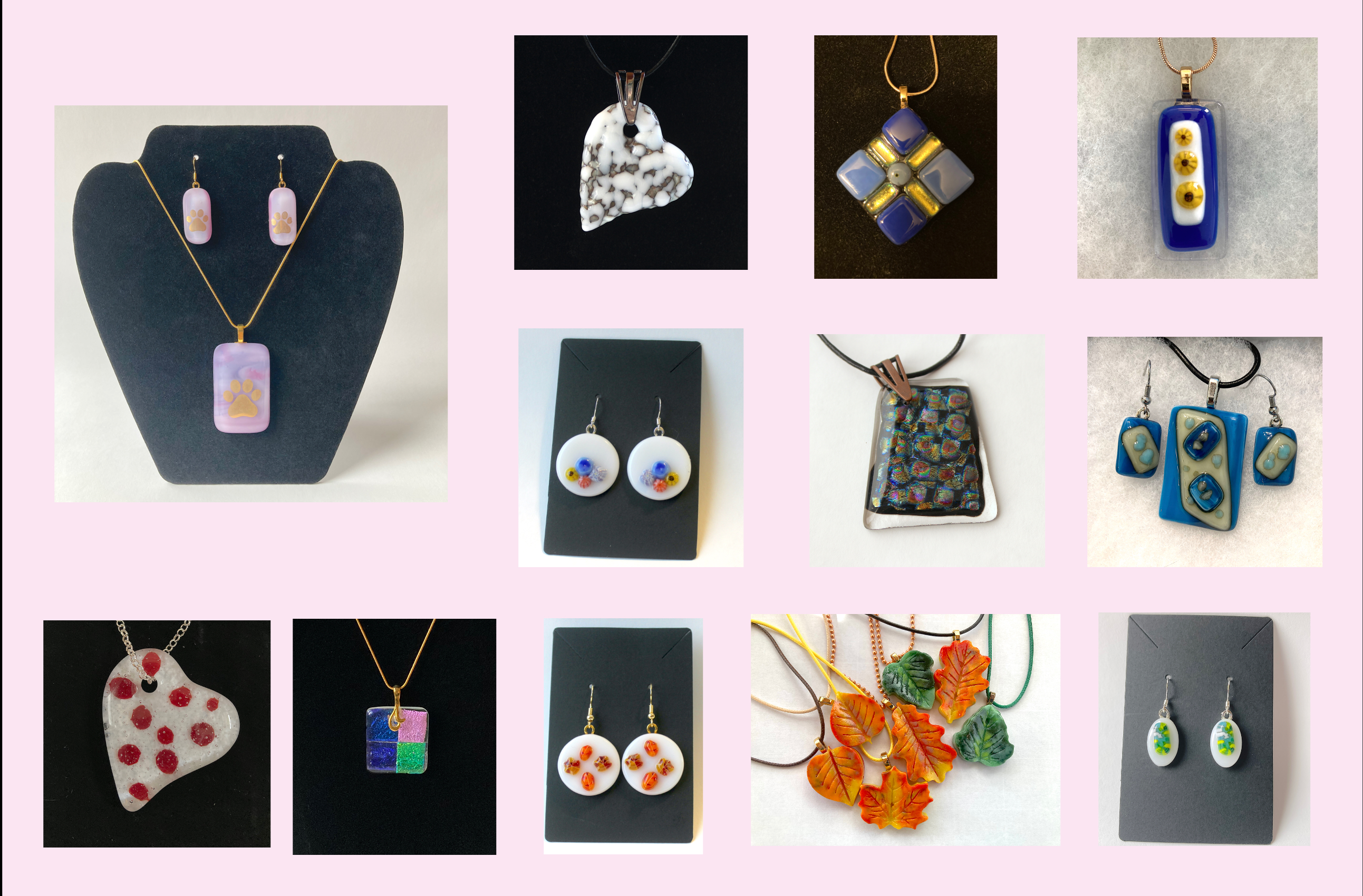 This eclectic collection of pendants, earrings, and sets will complement any outfit. From bold to subtle colors to shimmer & shine, you'll find just the right piece. Commissions accepted.