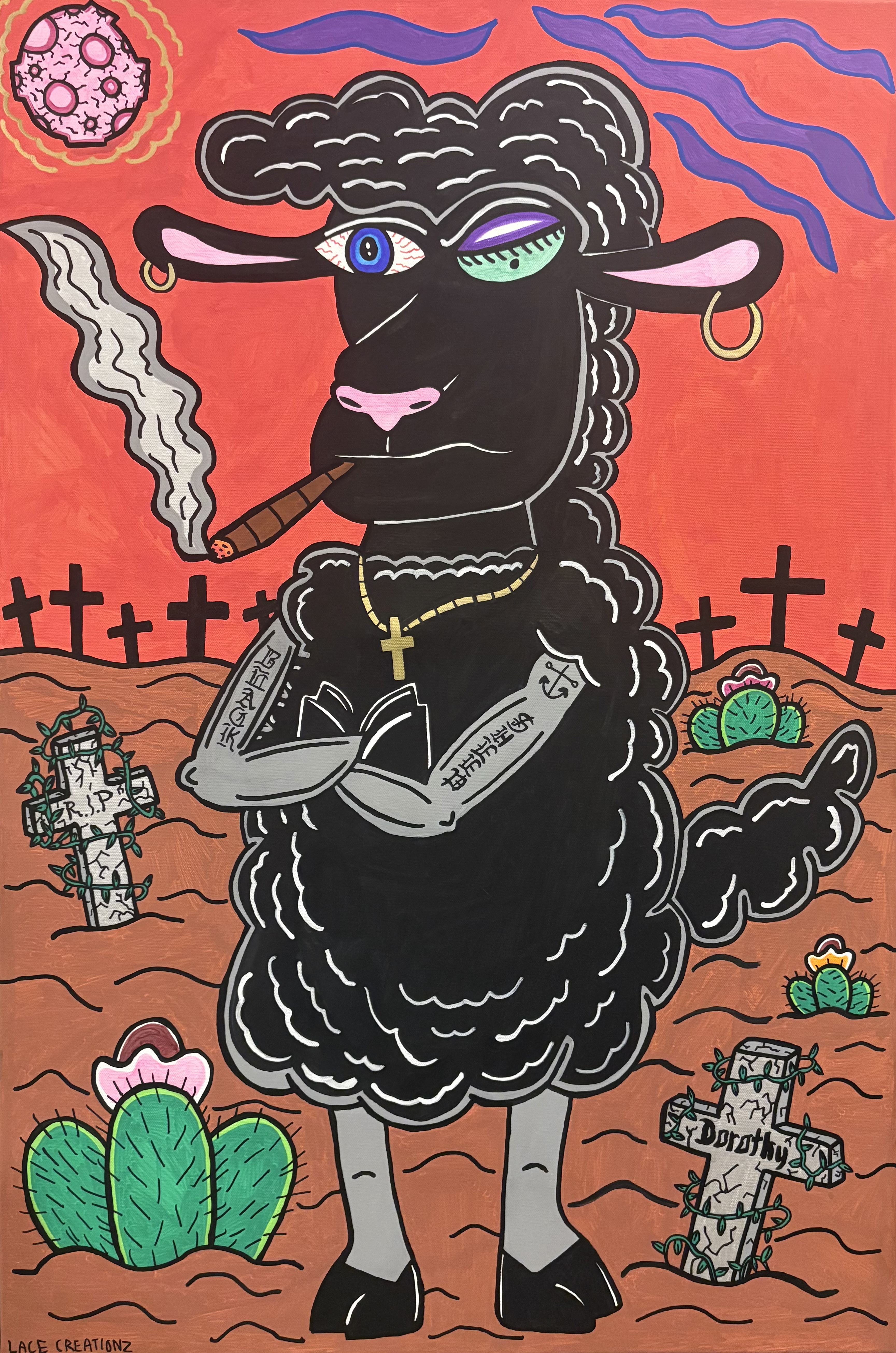 Based on the band name, this magical fox’s greatest magic trick is bedazzling your eyes! The original canvas was 20x16 inches and sold but prints of this design are available at lacecreationz.com if you are interested! This design was created in 2024.