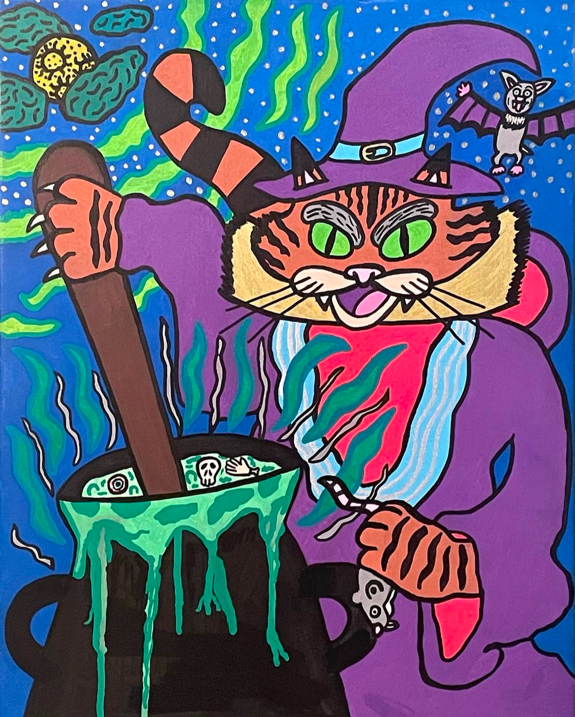 Originally designed on a 20x16 inch canvas in October 2022 with acrylics this cool cat will cast a spell on you… with his cuteness! The original canvas painting has sold but prints are available of this design at lacecreationz.com if you are interested!