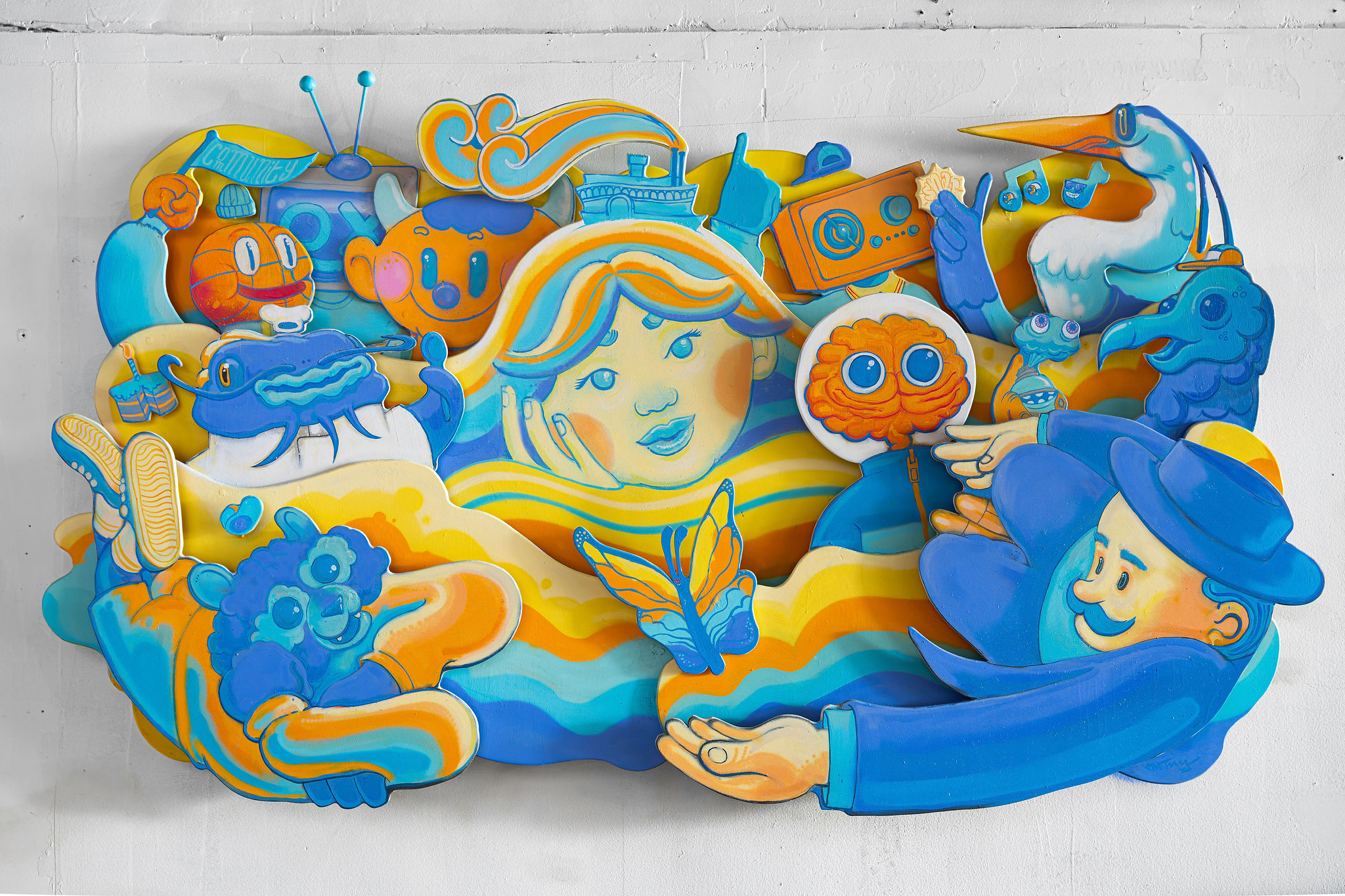 For this Big Tech commission, I created a site-specific, three-dimensional wall piece responding to the client's mission. Using the Ohio River as a metaphor for social media, I depicted characters inspired by local history and fauna, along with my own, to express how social media can positively share interests and build communities.