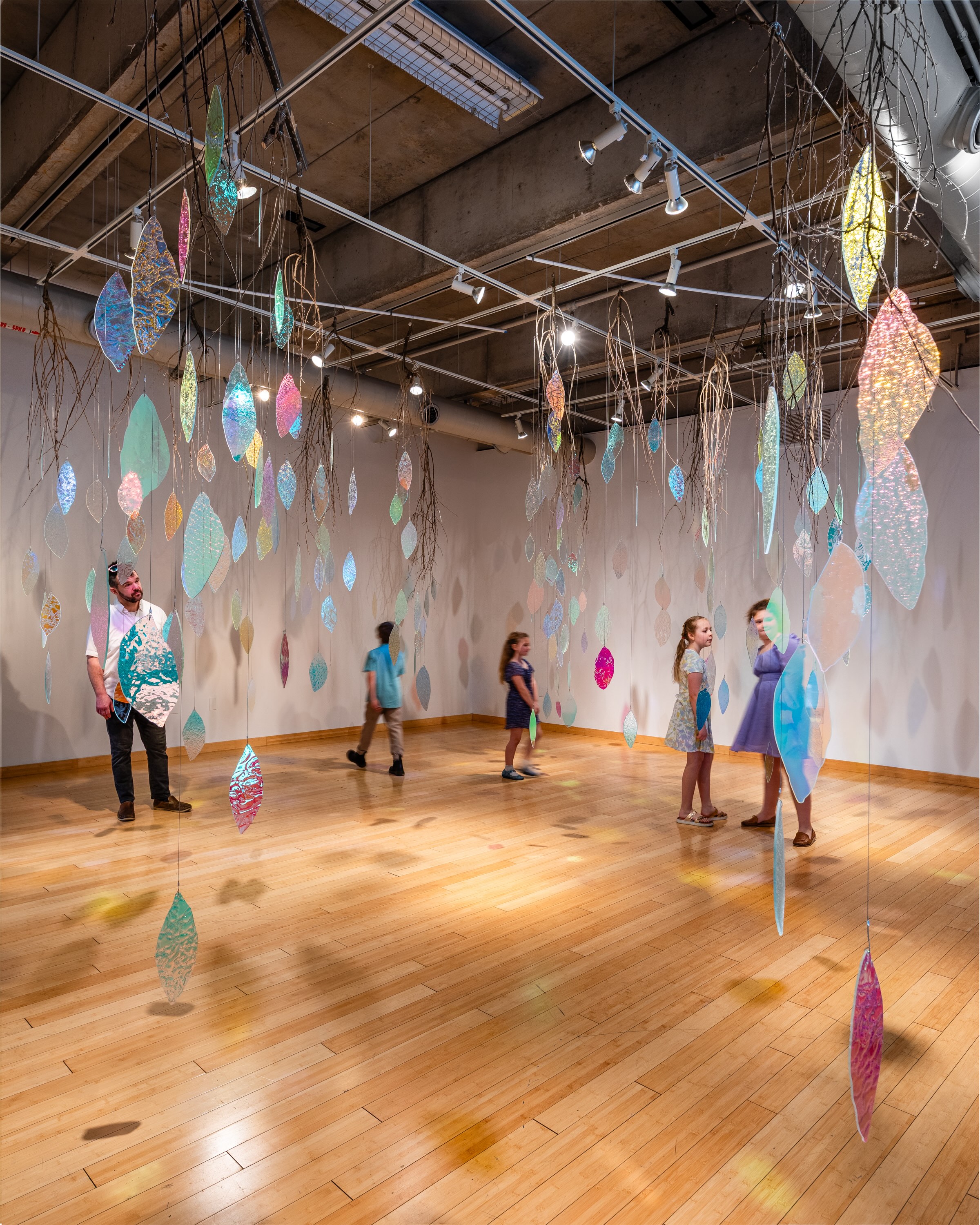 An installation of water jet cut plate glass coated with dichroic film hung in a space for people to walk through. Glass is cut into leaf shapes and hung from bundles of branches taken from native plants to Ohio.