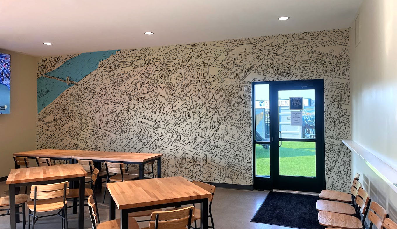 Hand drawn custom Cincinnati map that represents every building from the river to washington park installed in the offices of BIG Media downtown.