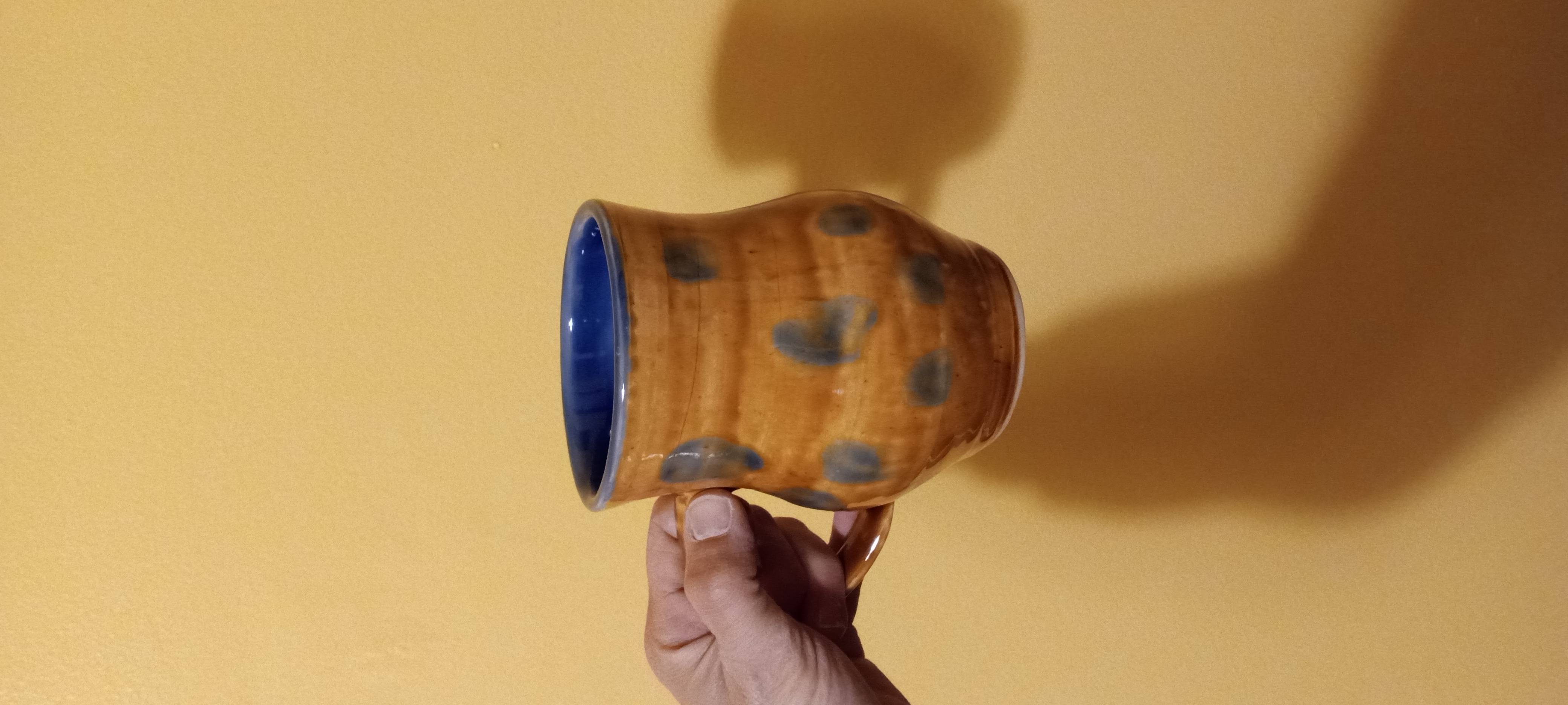 My favorite mug with a layered glaze combination of blue and amber and a nice curvy shape