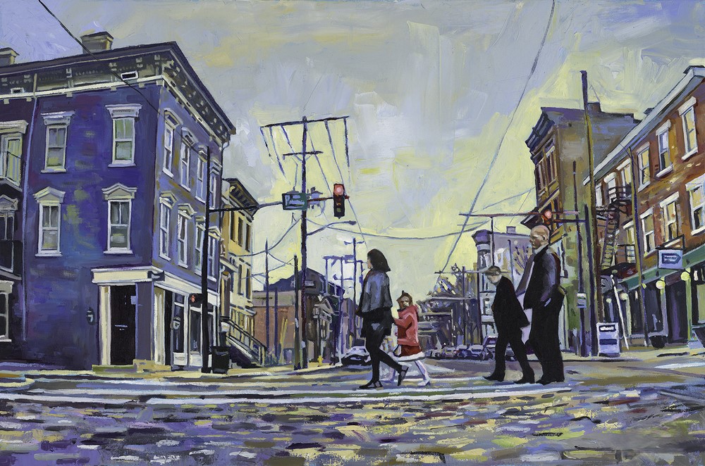 A painted scene from Historic Over the Rhine at Elm and 14th street, shows a family crossing the cobblestones and a little girl dressed in pink acting as the focal point.